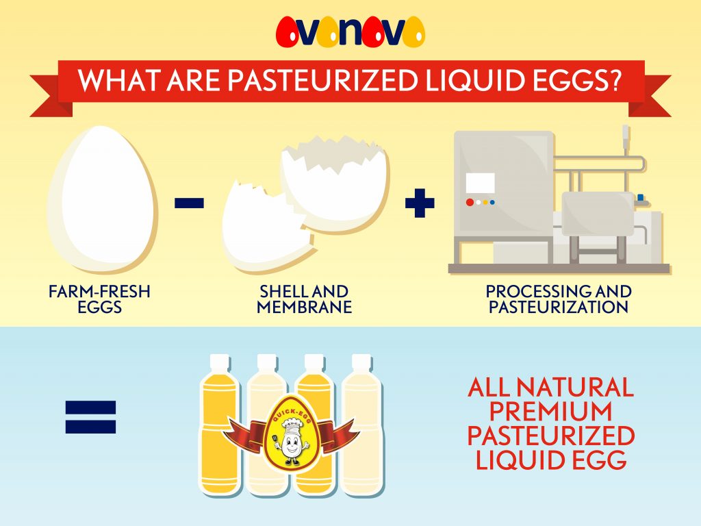 Quick-Egg Pasteurized Liquid Egg Product (“Quick-Egg”) is a line of egg products that have been removed from its shell, homogenized, and pasteurized to destroy bacteria and viruses. The process of pasteurization involves the use of heat to destroy harmful microorganisms present in the eggs without changing its composition and consistency. Quick-Egg is free from any additives or preservatives.